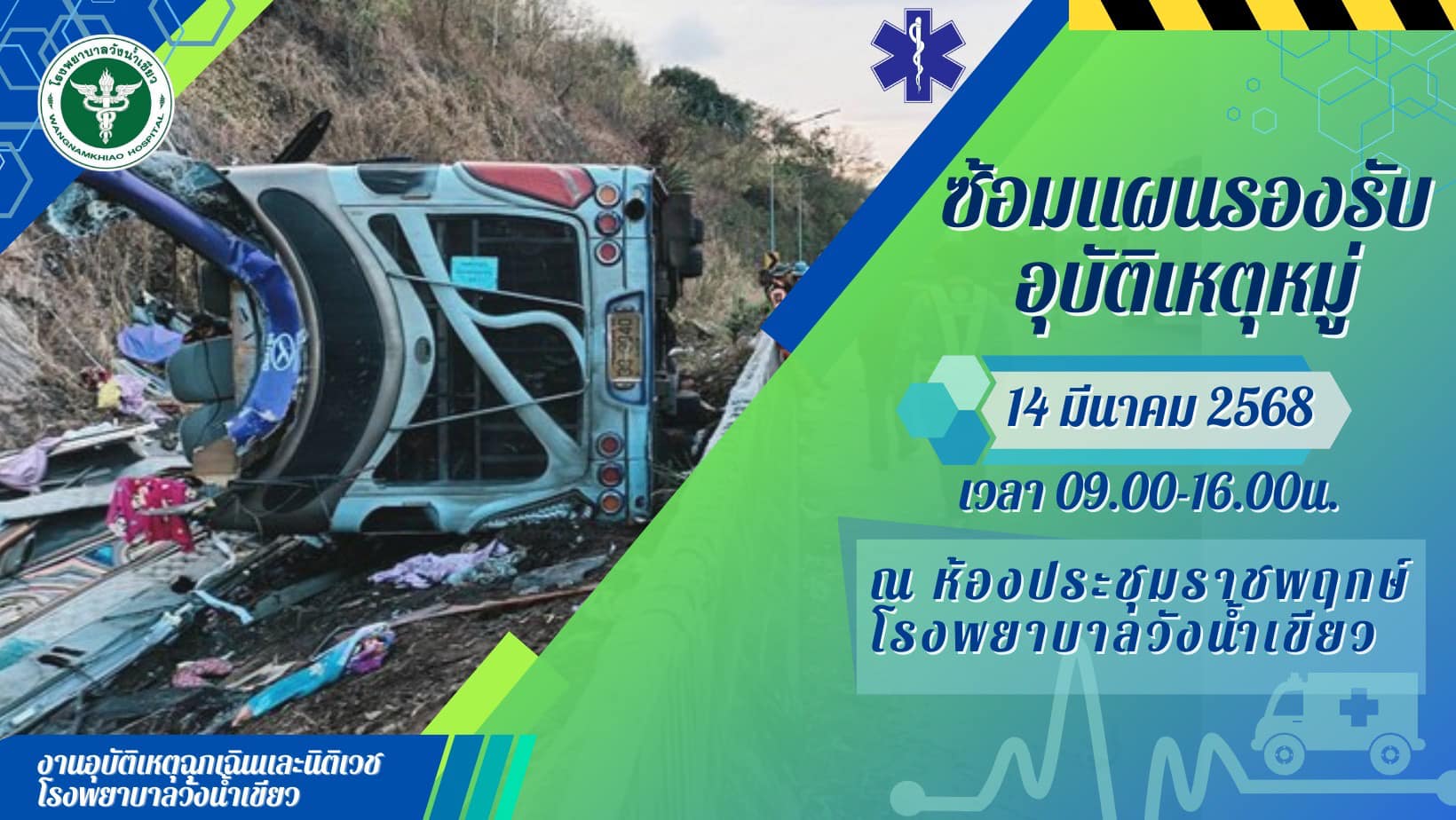 ในวันที่ 14 มีนาคม 2568 จะมีการซ้อมแผนรองรับอุบัติเหตุหมู่ ซึ่งอาจก่อให้เกิดเสียงดังรบกวนในเขตบริเวณรอบโรงพยาบาลจึงประชาสัมพันธ์เพื่อแจ้งให้ทราบโดยทั่วกัน และขออภัยในความไม่สะดวกค่ะ